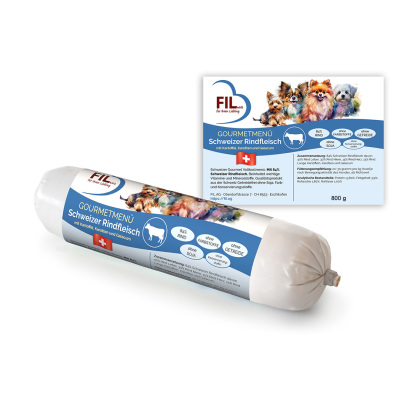 Ausgewogene Hunde-Vollkost­nahrung für Ihren Liebling. Mit viel frischem Fleisch und Gemüse aus der Lebens­mittel­produktion. Exklusiv nur bei Fil AG – Für Lieblinge und ausgewählten Tierfutter Ge­schäf­ten, Züch­tern und Züchterinnen erhältlich. Schweizer Rezeptur